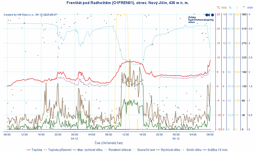 Zajímavé to rozdíly v teplotách nyní - na většině území mrzne (někde ještě dost), je nejspíše klidno, ale na východě místy fouká a je poznat teplo / fénový efekt. Za běžné situace mrazová kotlina, jinak ale náchylná na fénové efekt - Frenštát pdo Radhoštěm, kde je nyní cca +2,0 C.