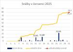 Červenec nám nadělil celkem 154 mm srážek, průměr mám 103 mm. Srážky byly pěkně rozdělené, nejvyšší denní úhrn byl 22 mm 8.7. a zaznamenal jsem i nepřetržitou šňůru třinácti dnů se srážkami nad 1 mm což bylo už dost otravné, ale výhledově srpen vypadá na stabilnější počasí, tak doufám, že to vyjde.