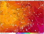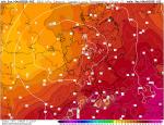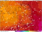 Teplota v 850 hPa odpoledne v dalších 3 dnech, opět je vidět na JV Moravě a hlavně na Slovensku bude velmi teplo. GFS 10.08.2025 00 UTC Střední Evropa +159-207 hod. teplota-geopotenciál v 850 hPa. Na západě ČR už ale teplotní rozhranní, mohlo by to přinést bouřky. Hlavně ta velká níže nad Německem a Beneluxem. Tam by mohly být na západní a JZ straně níže možná i dost vydatné srážky.