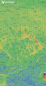 Takhle vidí maximální nárazy větru ALADIN. Většina republiky 40-50 km/h, na SV v západním závětří hor a kopců až kolem 80 km/h. To je už silný vítr, co způsobí menší škody.