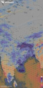 V uplynulých dnech (pátek až neděle a zejména v sobotu) zasáhla neobvyklá bouře Himálaje a konkrétně Mount Everest. Vždycky mě zajímalo, jak to může v praxi vypadat, pokud se to vyskytne v tak extrémně vysokém pohoří a skutečně se mi povedlo najít satelitní snímek mohutného bouřkového systému přímo nad Mount Everestem. Mount Everest není v mapě vyznačený, ale nachází se v SV okraji Nepálu na hranici s Čínou.