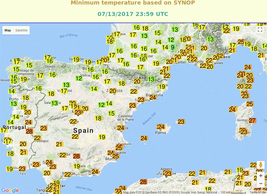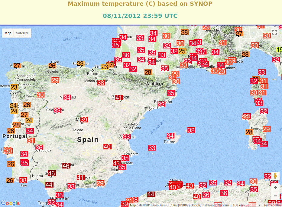 Zatim stale 2 stupne pod rekordem pro Pyrenejsky poloostrov z posLednich let (Cordoba (Spain) 13.07.2017 +47.3 °C resp. Amarelja (Portugal) 01.08.2003 +47.4 °C). Absolutni oficialni rekord pro Evropu je Catenanuova (Italy) 10.8.1999 +48.5 °C.Na Ogimet jsou jen synopticke stanice, ne vsechny.