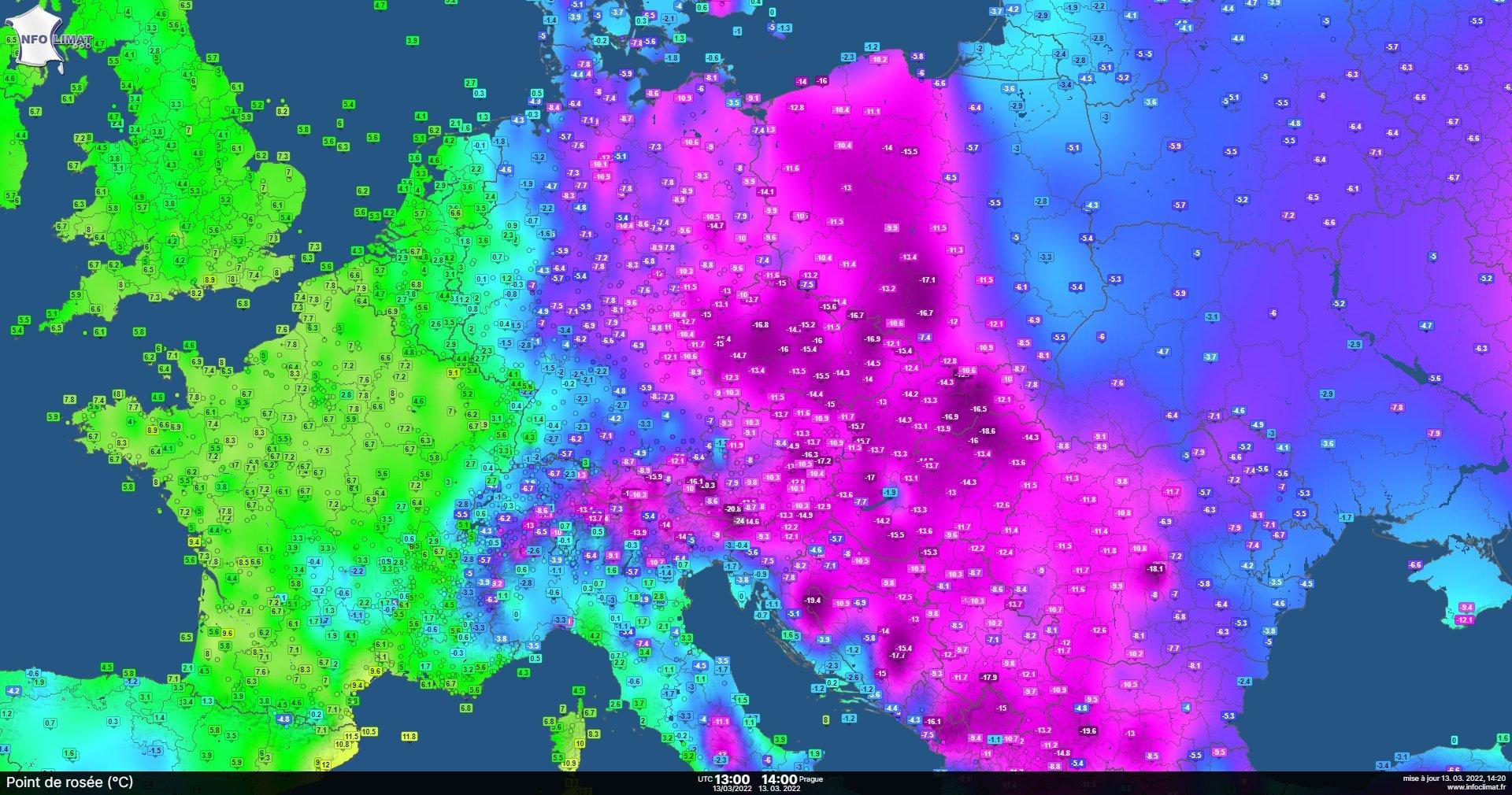 Na mape stredni Evropy rosny bod 13.03.2022 13 UTC nejnizsi hodnoty (stanice neuvedeny) Ceska Republika -16.9 °C, Slovensko jih -16.9 °C, v Tatrach jeste mene, Madarsko -18.6 °C (stanice na Balatonu vsak -1.9 °C, voda kolem), Rakousko -20.8 °C, Rumunsko -18.1 °C, Polsko (vychod) -17.1 °C, Nemecko -14.7 °C. V Praze je uvedena hodnota -16.8 °C, Slovinsko, blizko bodu Slovinsko-Rakousko-Italie v horach -24 °C. Data - zdroj mapy infoclimat.fr