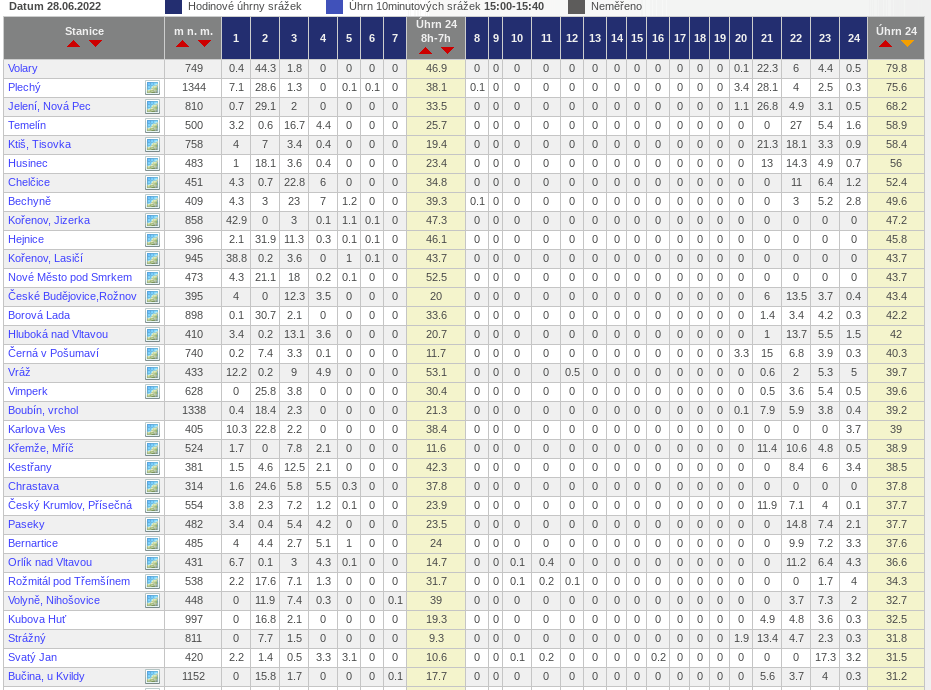 Ve dnech 23-25.06.2022 je nahore uveden datum o den vyssi, nez ke kteremu hodnoty srazek skutecne patri. Stanice jsou serazeny sestupne od nejvyssiho srazkoveho uhrnu za 24 hod 00-24 SELC.