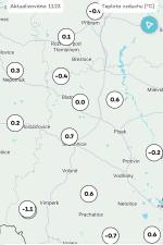 U nás je to na nule,zataženo,klidno a sněží,je tak 1cm sněhu a ještě jedna várka příjde kolem poledne,mělo toho být víc ale aspoň tohle.
