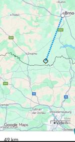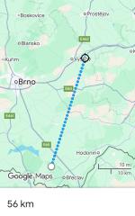 Tak a ještě poslední restík, na který jsem dnes neodpověděl. Brno Dyjákovice, vzdušnou čarou necelých 50 km. A po silnici 59 km. Lednice Ivanovice, vzdušnou čarou 56 km, po silnici přes 70 km. Takže určitě né 90 km, a první případ, určitě né 70 km. Jedině, že by lhala Google navigace? No řekl bych, že mých psaných cca 50km, v původním příspěvku, je prakticky blíže, než Vámi uváděných 90 km