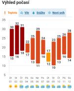 Zítra zřejmě ty nejvyšší teploty,a to v Čechách,jsem zvědav,zda se známé lokality přiblíží k 38 stupňům. Ve čtvrtek už to na Moravě zřejmě tolik nebude a později odpoledne a večer můžou být srážky četnější na jihu Čech a západní Moravě (ČHMÚ). V neděli opět přechodný příliv velmi teplého vzduchu od J,JZ a pak chladnější a vlhčí SZ a snad nějaké plošnější srážky.Jj,ta JM má ve výhledu pěkný srážkový dardy,k tomu maxima 14 - 15 stupňů,věřte - nevěřte…