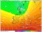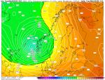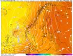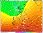 Jak to ještě v době přechodu níže a v době nejvyšších nárazů větru vypadalo v 850 hPa. Tak samozřejmě geopotenciál v 850 hPa se ve středu níže rovněž výrazně propadl (stejně jako přízemní tlak). Ale ani zdaleka ne tak, jak se to děje v průběhu zimních větrných bouřích. Teplota a tlak v 850 hPa v celé níži na poměrně vysoké hodnotě oproti podzimním-zimním situacím tohoto typu. Opět ve stejné termíny teplota-geopotenciál v 850 hPa GFS 04.08.2025 06 UTC +3-6 hod.