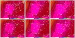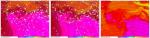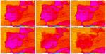 Nadcházející vlna veder ve Španělsku 14-16.08.2025 - teplota v 850 hPa ve Španělsku každý den v 17 UTC, přibližně v době maxima, podle GFS 14.08.2025 horní řádek z 00 UTC a dolní řádek z 12 UTC.
