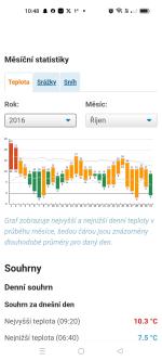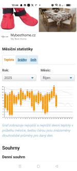 V tom letošním říjnu nejsou tady v maximálních teplotách nějaké extrémy, je tak nějak pořád stejně, jeden den max +17 a teplota neklesla pod +10, ani dnes oproti kose v Čechách. Extrém byl v minimálkách hned z kraje měsíce pod -3 a pak ještě 2x to švihlo. Srážky jsou dost otravné, vůbec žádné se nevyskytly jen v šesti dnech a zítra bude nejchladnější den v říjnu, těch +10 to už nepřeleze, možná ani v úterý. A pak zas jak to vypadá nadprůměrný začátek listopadu a kdoví jak dlouho to vydrží, nakonec bude listopad teplejší jak říjen