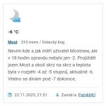 Tak pane kolego, opět a dokola přehánění, a dokazování, že jedinou pravdu máš ty? Tak si tady dáme nějaký fakta, k tvému textu a kritice jiných uživatelů. Bohužel musím opět na tebe reagovat, protože ti schází respekt, k celkem velice solidním informacím, od ostatních kolegů. Vážně sem mám dát zhruba 10 screenshotů, které vyvrátí tvoje informace? Ono nestačí, žes nám tady s kolegou odpálil mladého kolegu Dana Stehlíka, který sem delší dobu, dával cenné informace z Lounska a Žatecka? Teď nám tady budeš odpalovat dalšího mladého kolegu ze SZ, tentokrát z Mostu, který jen za tento týden sem přispěl 28 příspěvky do Počasí u vás, a můžu říct, že jsou prakticky úplně v pohodě. A pak sem opět jednou za rok nastoupíš ty, co sem dá příspěvek v lednu, v červenci a teď, a bude tady kritizovat někoho, kdo se velice solidně snaží na časté denní bázi? Není ti to trapný? K tomu textu, osobně jsem našel dost stanic na WU, které měly v 18h, teplotu okolo -2°C v Mostě. To samé stanice Netatmo, vzal jsem několik, opět shodně okolo -2°C. Takže ok, jestli ty jsi naměřil všude -4 až -5°C v 18h po celém městě, tak ok. A pak o 4 hodiny později nám ve stejném textu píšeš, že je -6°C. Když se podívám, ať už na oficiální Kopisty, a nebo si projedu mraky soukromých stanic v Mostě, tak většina klesla zhruba o 4 stupně, za ty 4 hodiny. Pak v tom případě mi vůbec nevycházejí tvoje informace, nebo že najednou máš ty pokles zhruba za 4h, o jeden stupeň? Vážně mně mrzíš a doporučil bych ti toho zanechat, nebo tady zveřejním jeden screenshot, kde si byl o 5°C mimo, než realita, a ještě jsi měl tu drzost, a kritizoval tu dalšího uživatele, a to MostMost, a dal jsi sem informaci, že on sem dává hodnoty teploty, o deset stupňů jiné. Příspěvek si během pár minut smazal. Já si ho naštěstí uložil