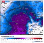 Ono ta celková sněhová pokrývka by byla v Čechách podobná jak ukazuje suma sněhu, ale třeba místo 30cm by bylo 20cm, Jihlavě jelikož je tam celkově chladněji 50cm být mohlo. Ale u nás na Moravě jelikož to ukazuje 1. TN pro Moravu a další 2 pro Čechy a poslední opět Morava, tak by tu byl trvale sníh až od ní, takže tak 15cm místo 30cm.
